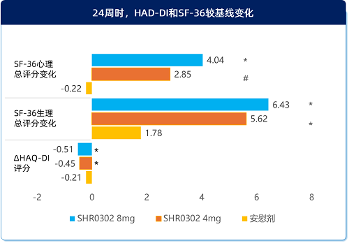 图6 艾玛昔替尼组与安慰剂组HAD-DI和SF-36评分改善情况